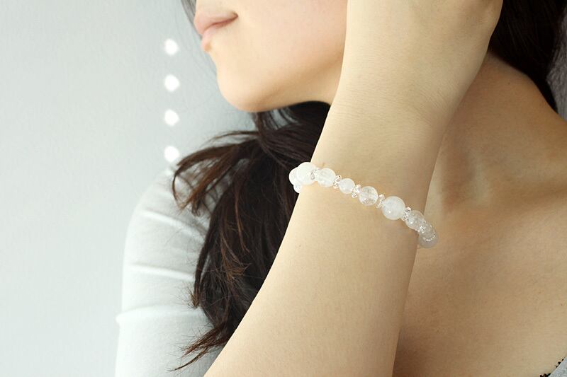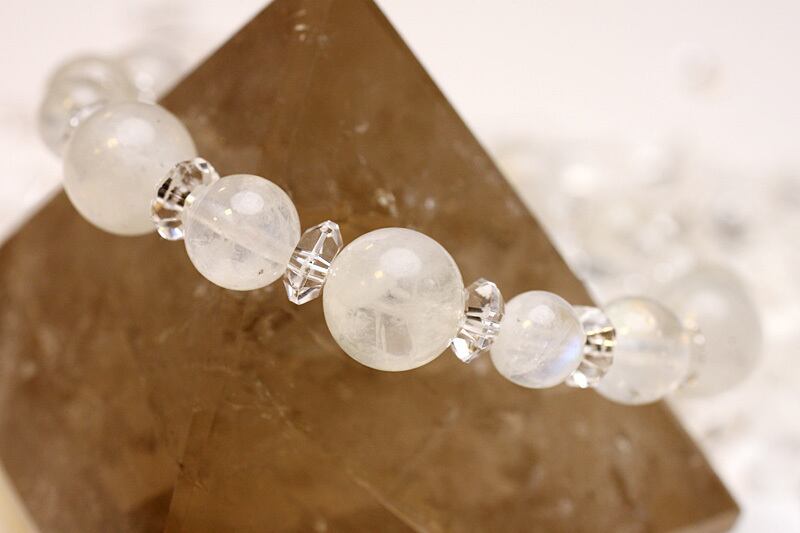 直観力を鋭く、サイキック能力を開花、思わぬ幸運を手にするなど神秘のパワーに溢れたムーンストーンをふんだんに使ったブレスです。