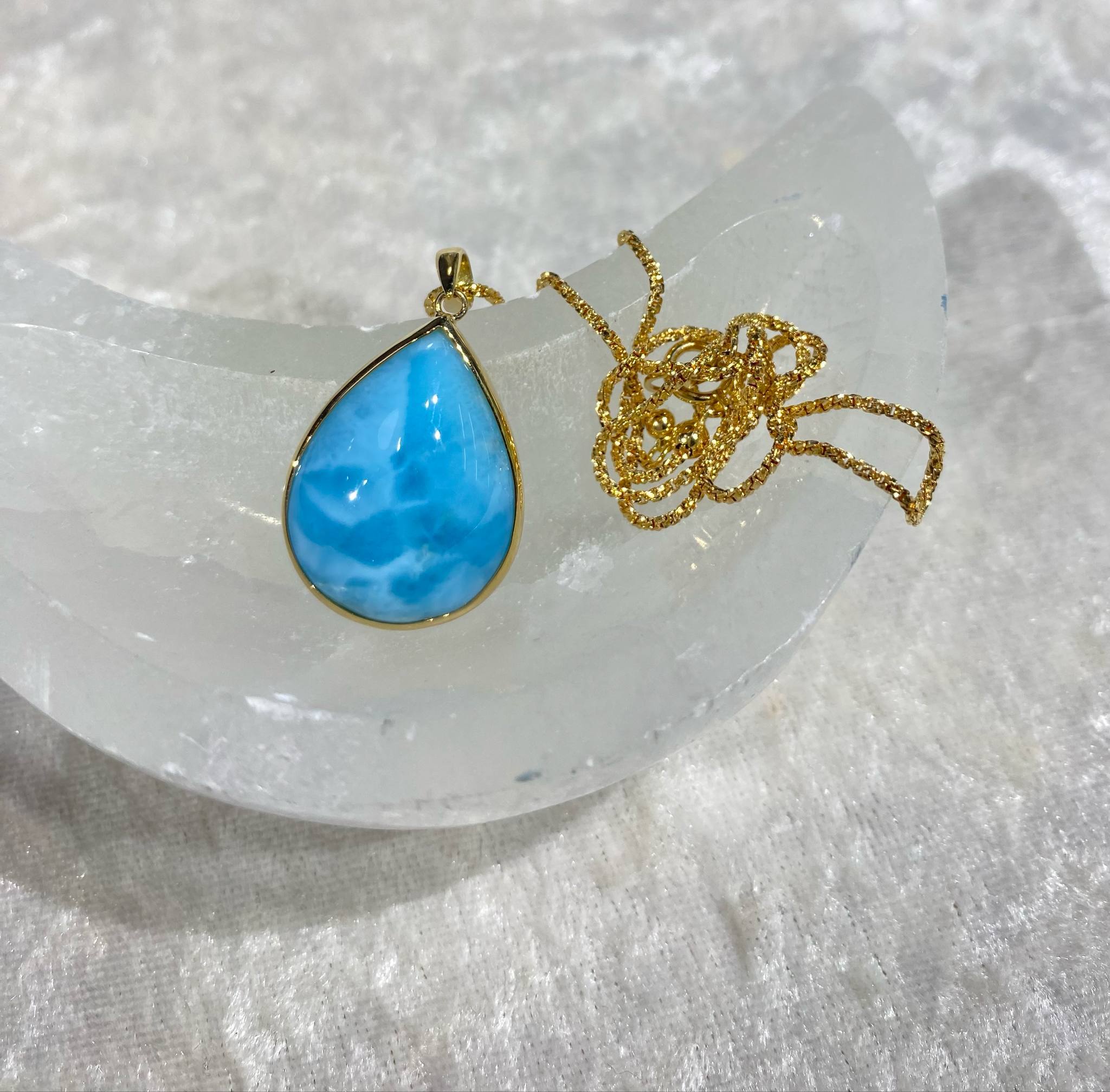 神秘的な海のような美しい色合いをもつドミニカ共和国産のラリマー。その魅力は、心を穏やかにし、ストレスや不安を和らげる効果があるとされています。このペンダントは、ラリマーの純粋な美しさを最大限に引き立てるK18のフレームで丁寧に仕上げています。身に着けることで、毎日のスタイルに特別な輝きを添えます。