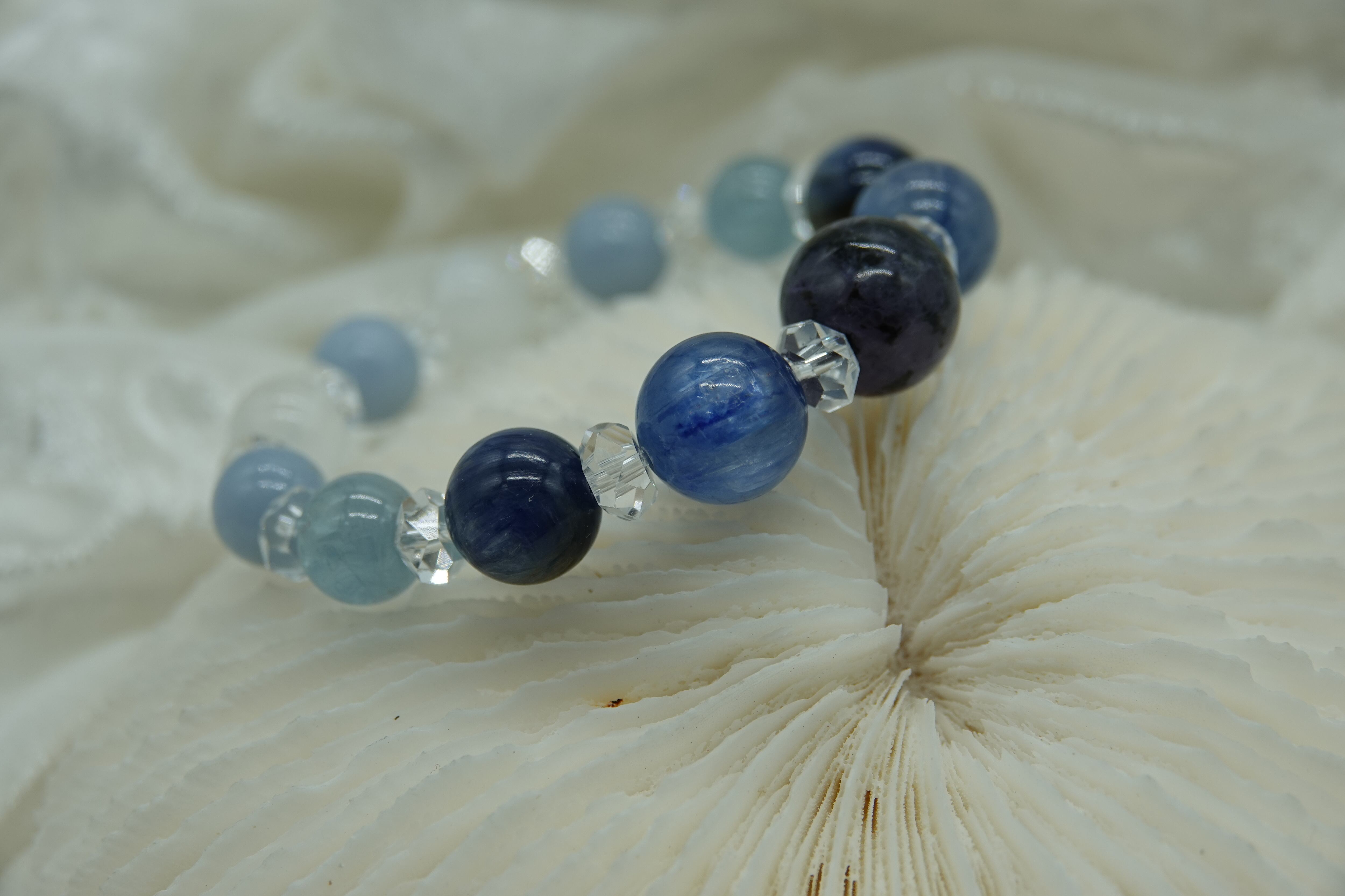 見るだけでも心が深く落ち着いてくるような青のクリスタルたちのブレスレットです。