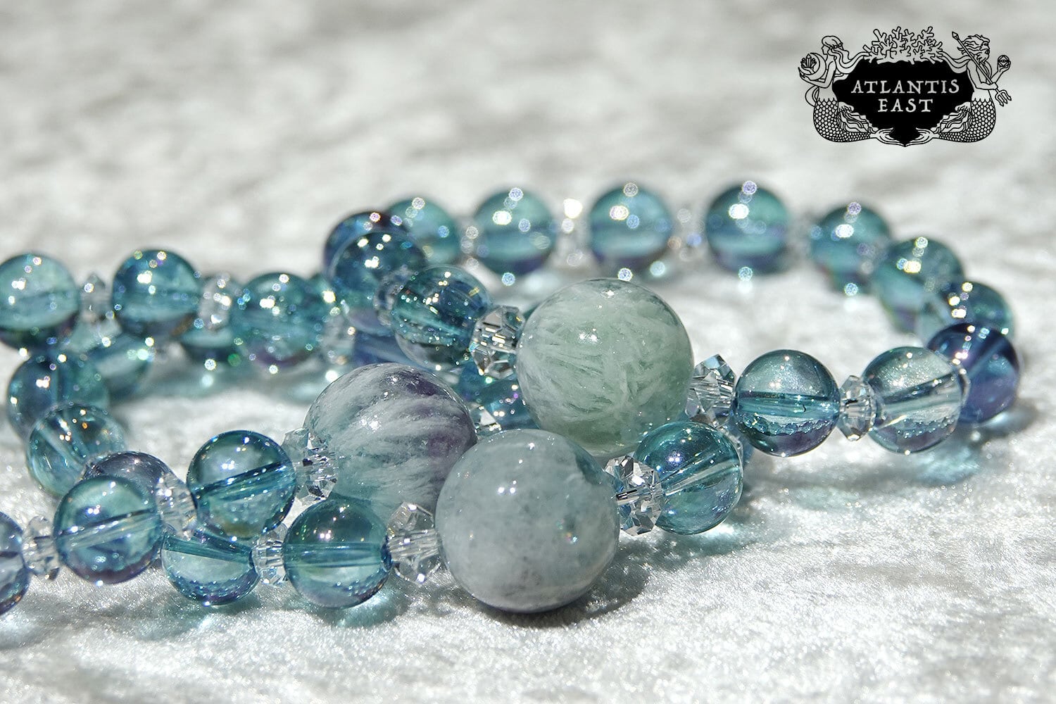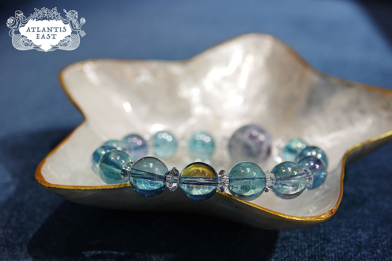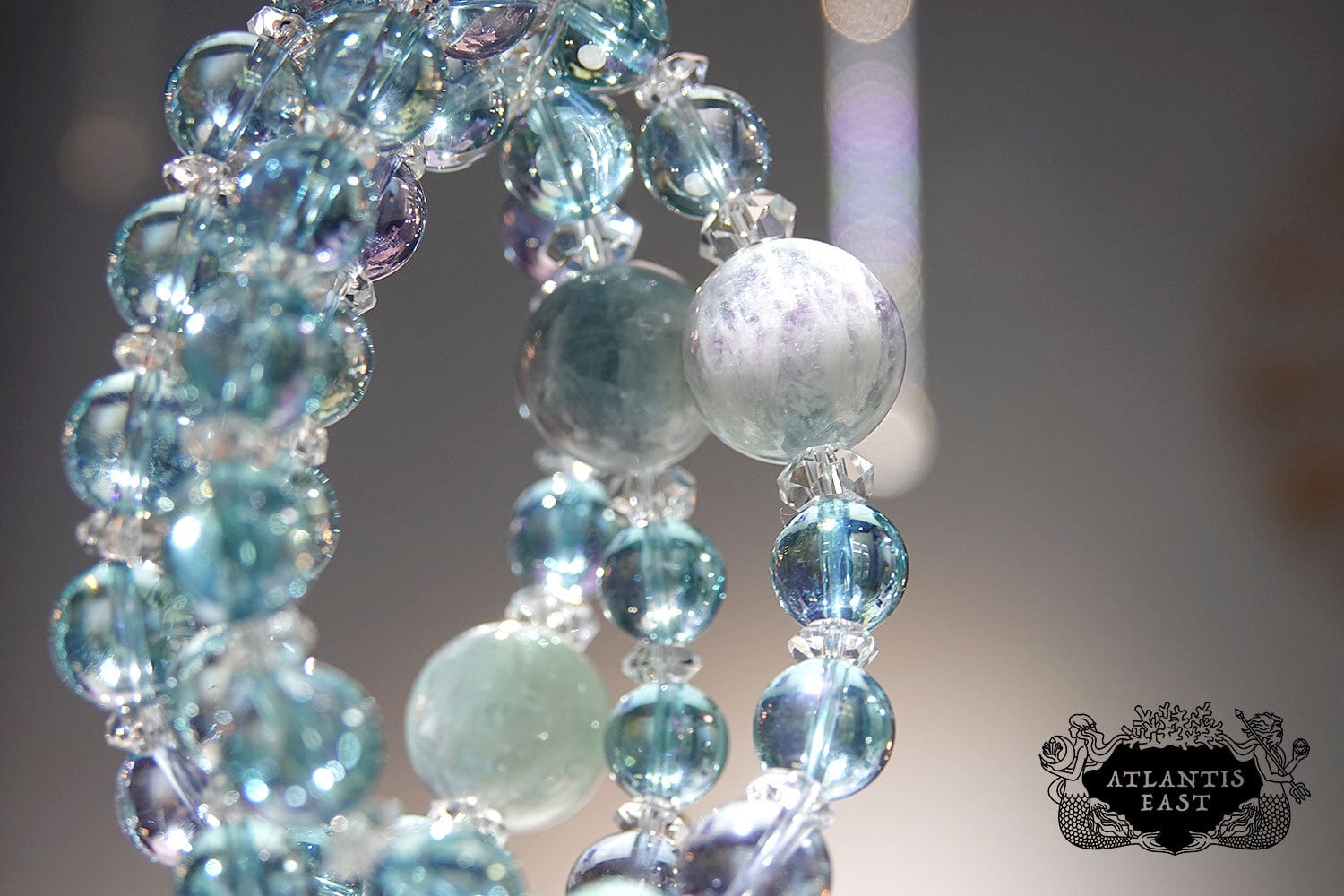 水晶に金やプラチナ、チタンなどを高温で蒸着させることでこの輝きが出ています。